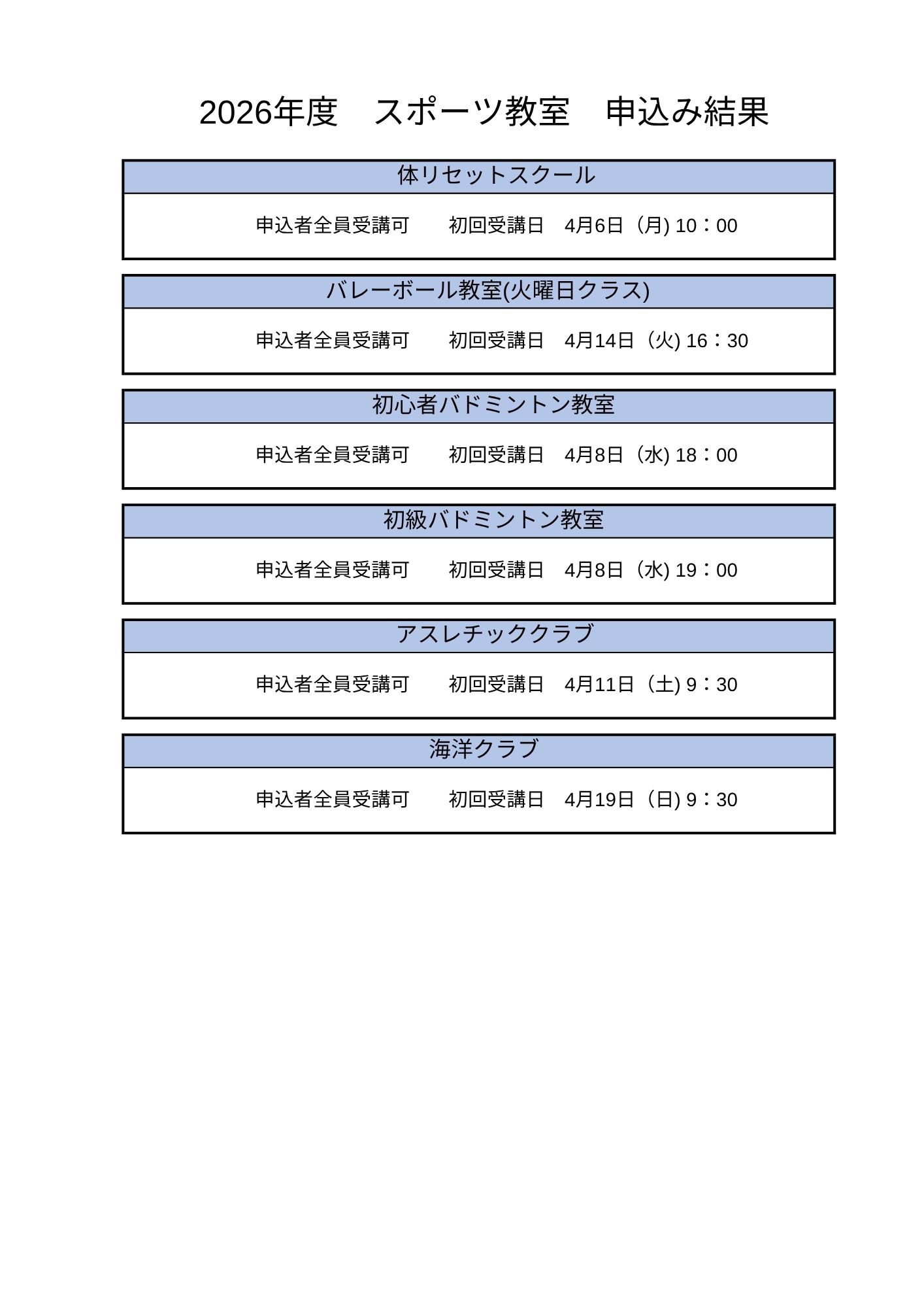 2026年度スポーツ教室申込み結果について