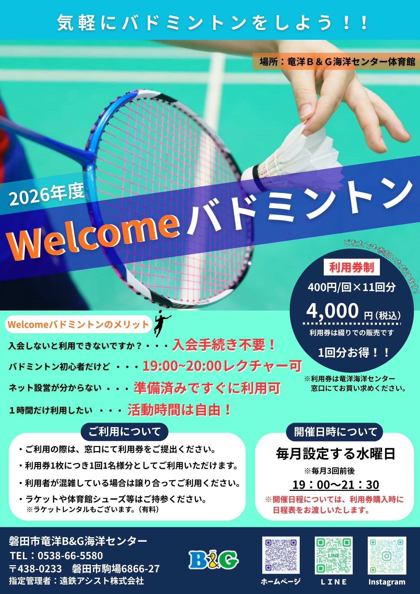 Welcomeバドミントン 竜洋海洋センターでバドミントンをしよう!! 利用券を購入すれば、どなたでも体育館でバドミントンができます。 月に3回程度、体を動かしてみませんか?? ※詳しくは下記チラシをご確認ください。